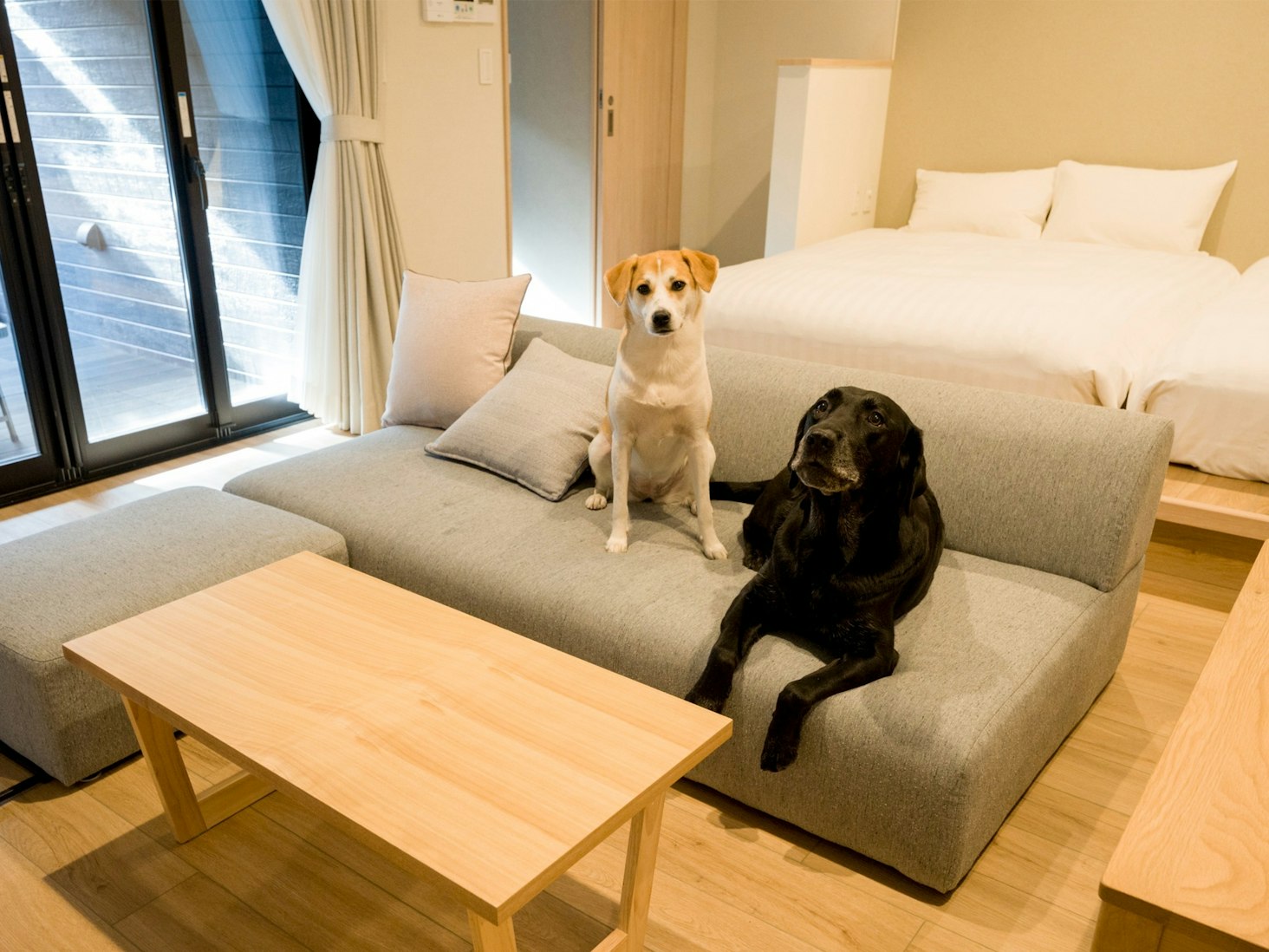 リビングで愛犬とくつろげる「Rakuten STAY 日光宝殿」。