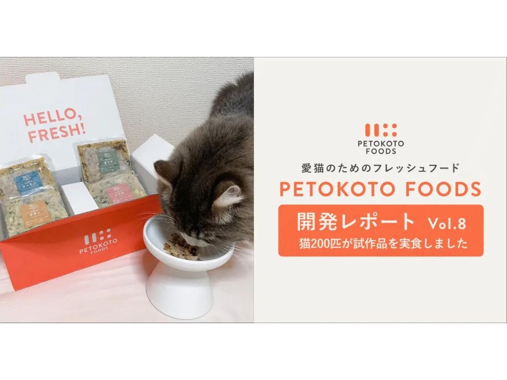 猫のための理想のごはんをつくるために始まった「PETOKOTO FOODS for CATS」の開発プロジェクト。社員猫や社員の試食を何度も繰り返し、ついにプロジェクトにご協力いただいているニャドバイザーの皆さんにも試作品をお届けすることができました。今回ご協力いただいたのは、100家族200匹ほどの飼い主さん&ネコちゃんたち。新鮮な食材を栄養や旨味が失われないように低温調理し、急速冷凍したフレッシュタイプのキャットフードを4つの味「チキン・マグロ・サーモン・カツオ」でお届けしました。