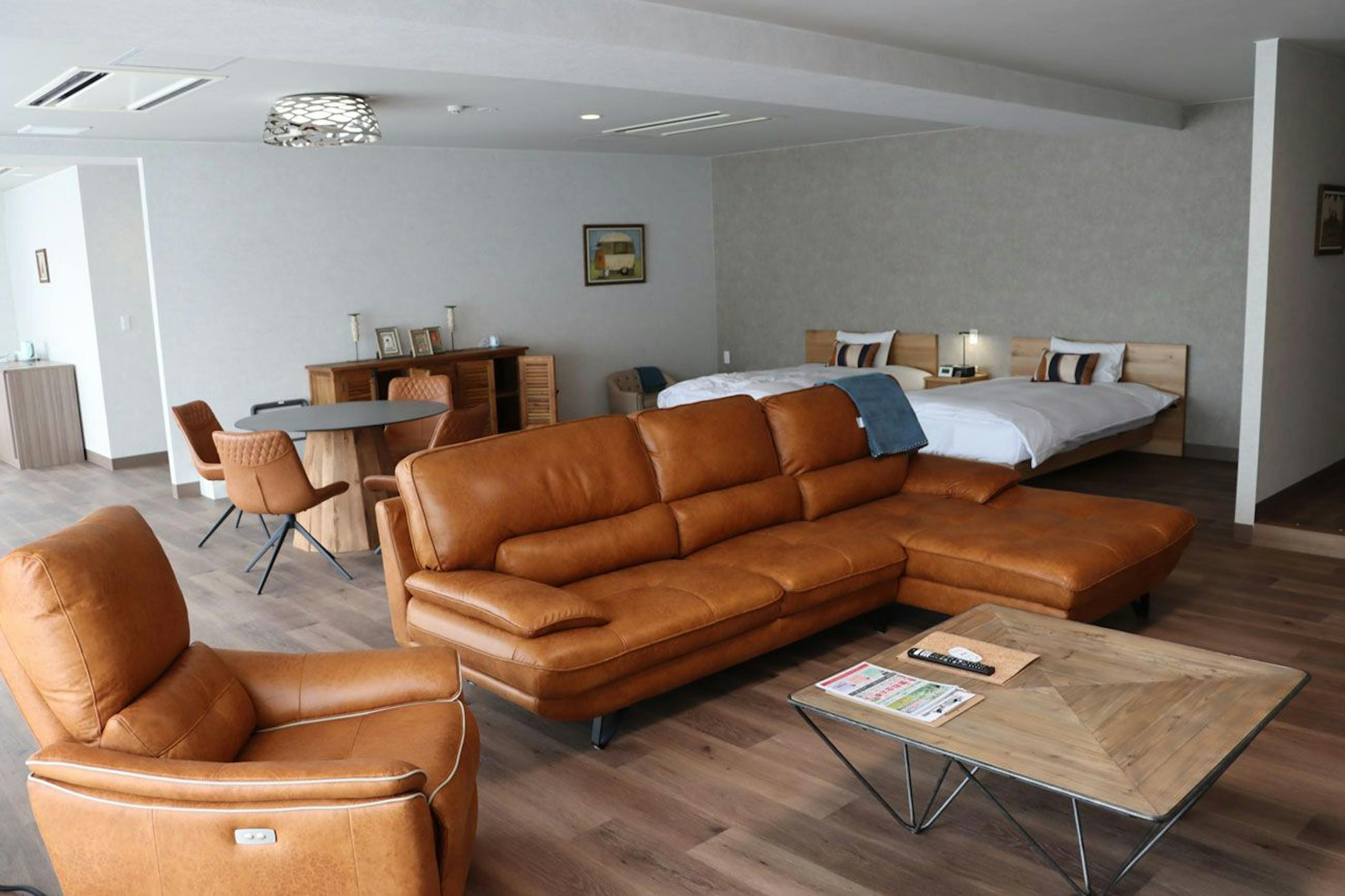 愛犬と泊まれるヴィラ「暁(Akatsuki)」は、ミッドセンチュリーの香りに包まれた広々とした1LDKの空間です。リビングにはプロジェクターや音響設備が整っており、愛犬用のアメニティも充実しています。ペットは2頭までで、大型犬も同伴可能。広さ約79平米のヴィラは、クイーンベッド2台とデイベッド1台を備え、最大5名様まで宿泊できます。