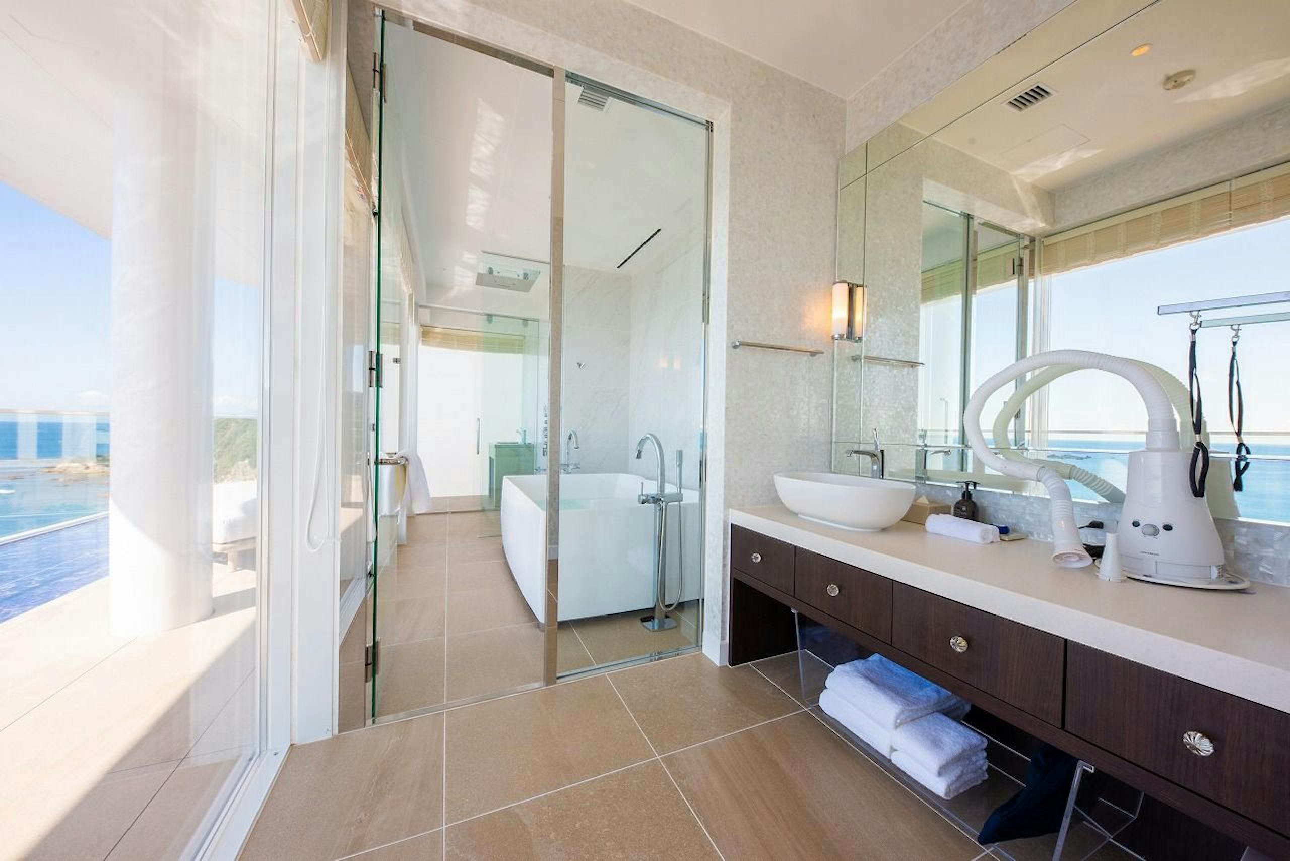 広々としたプライベートテラスからは、パノラマオーシャンビューを堪能でき、海風と波の音が心地良い空間で愛犬との特別な時間を楽しめます。テラスにはジャグジーがあり、水着着用で利用可能です。